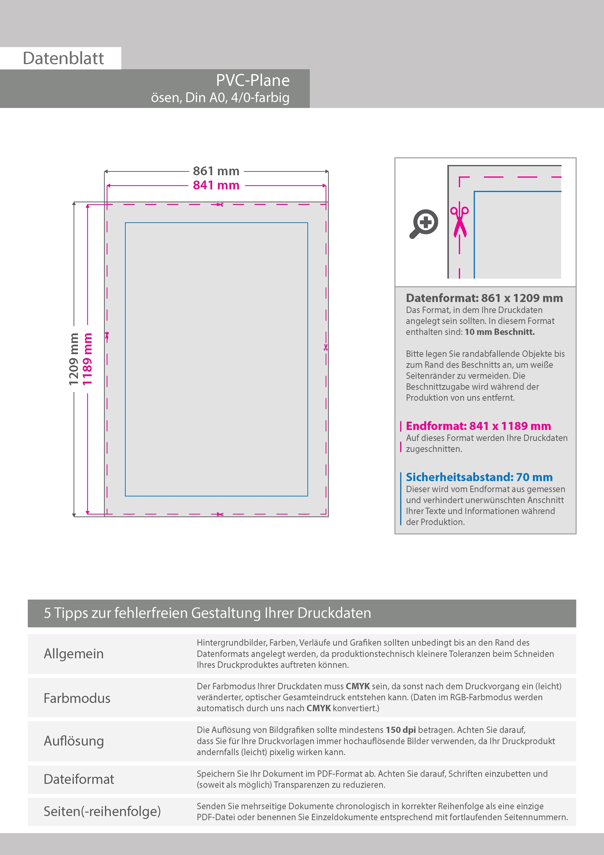 Hochwertige PVC-Plane DIN A0 (84,1 x 118,9 cm), 4/0-farbig bedruckt, Ösen im Abstand von 50 cm links und rechts