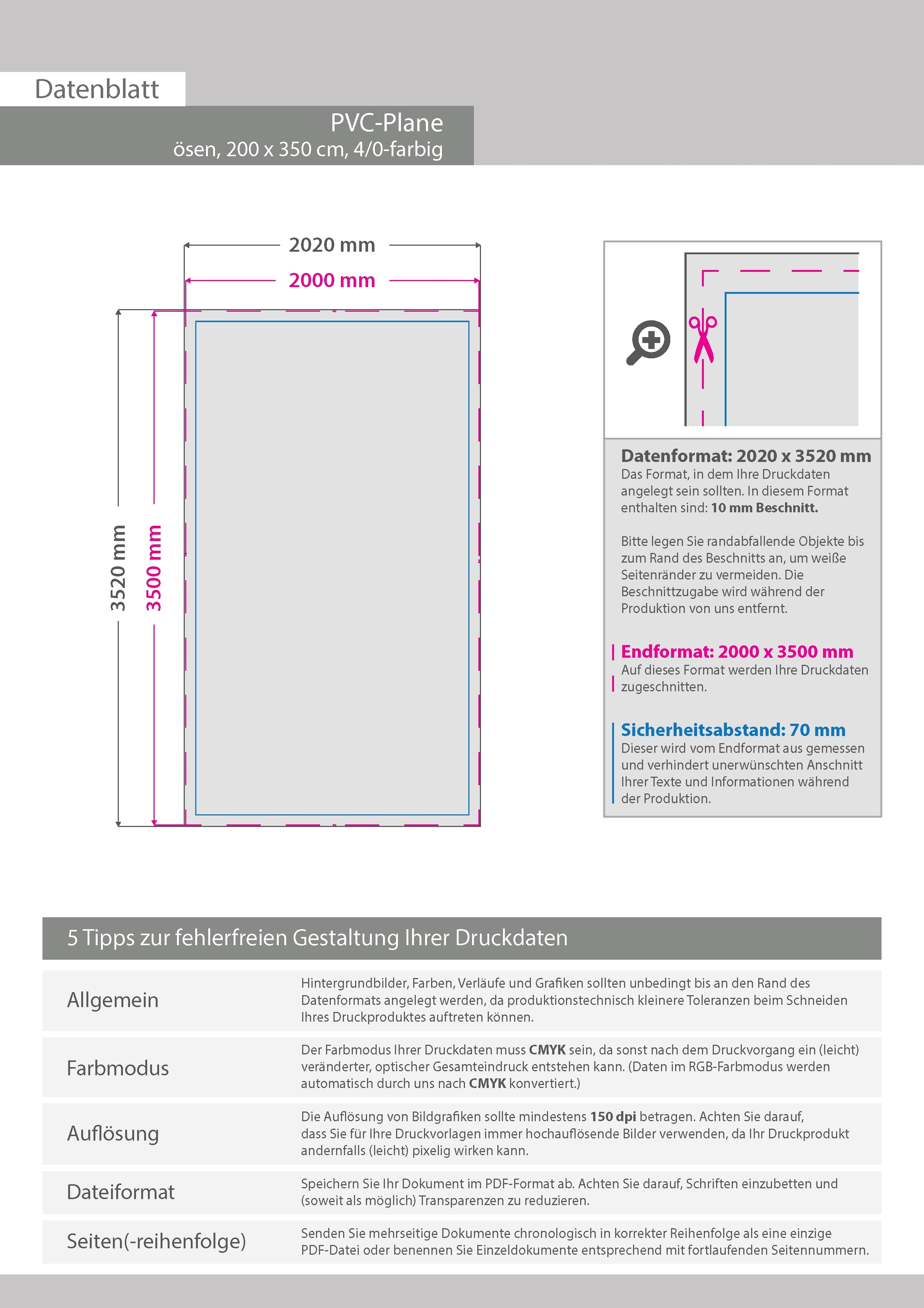 Hochwertige PVC-Plane 200 x 350 cm, 4/0-farbig bedruckt, Ösen im Abstand von 50 cm links und rechts