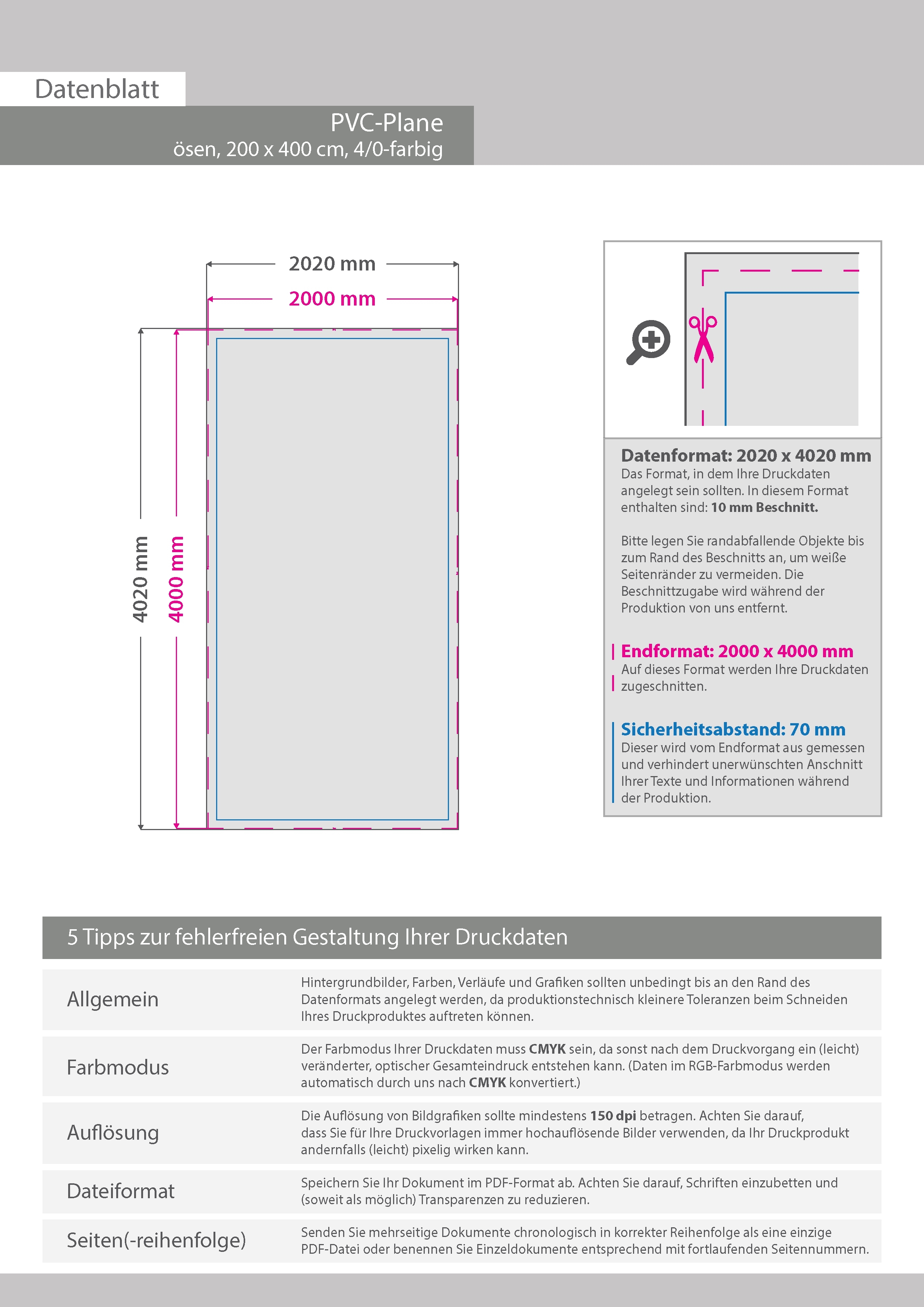 Hochwertige PVC-Plane 200 x 400 cm, 4/0-farbig bedruckt, Ösen im Abstand von 50 cm links und rechts