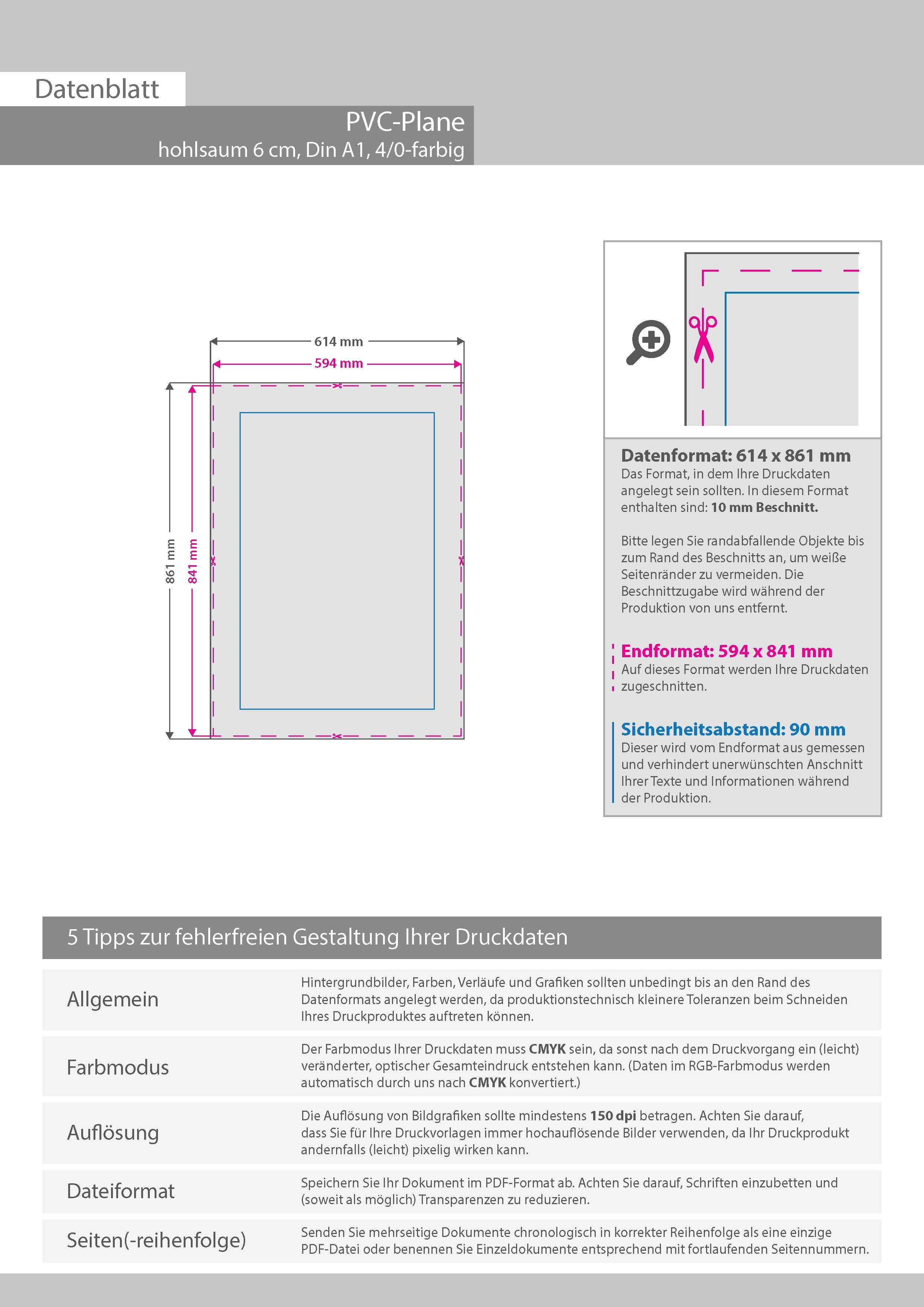 Hochwertige PVC-Plane DIN A1 (59,4 x 84,1 cm), 4/0-farbig bedruckt, Hohlsaum oben und unten (Durchmesser Hohlsaum 6,0 cm)