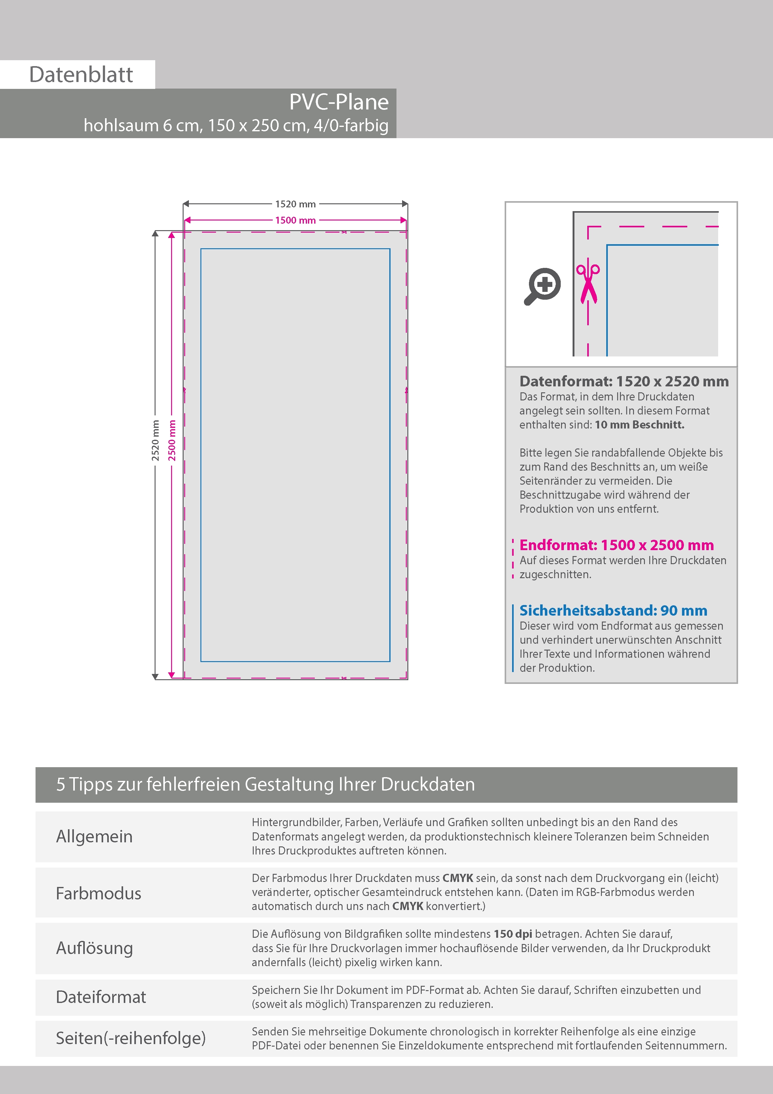 Hochwertige PVC-Plane 150 x 250 cm, 4/0-farbig bedruckt, Hohlsaum oben und unten (Durchmesser Hohlsaum 6,0 cm)