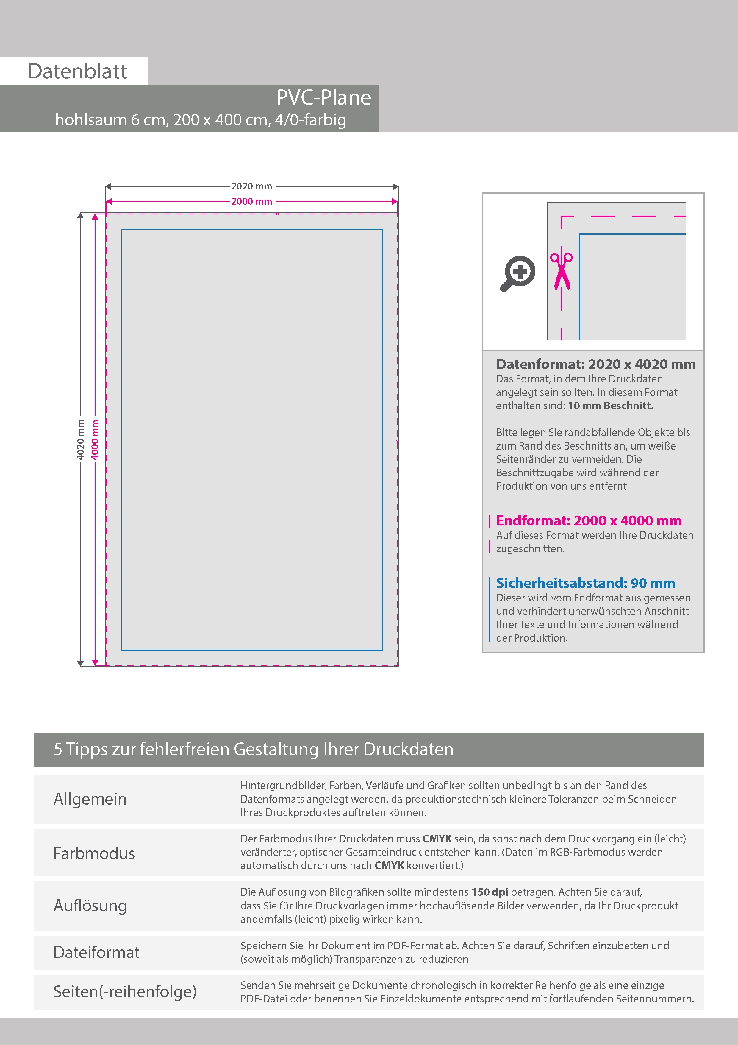 Hochwertige PVC-Plane 200 x 400 cm, 4/0-farbig bedruckt, Hohlsaum oben und unten (Durchmesser Hohlsaum 6,0 cm)