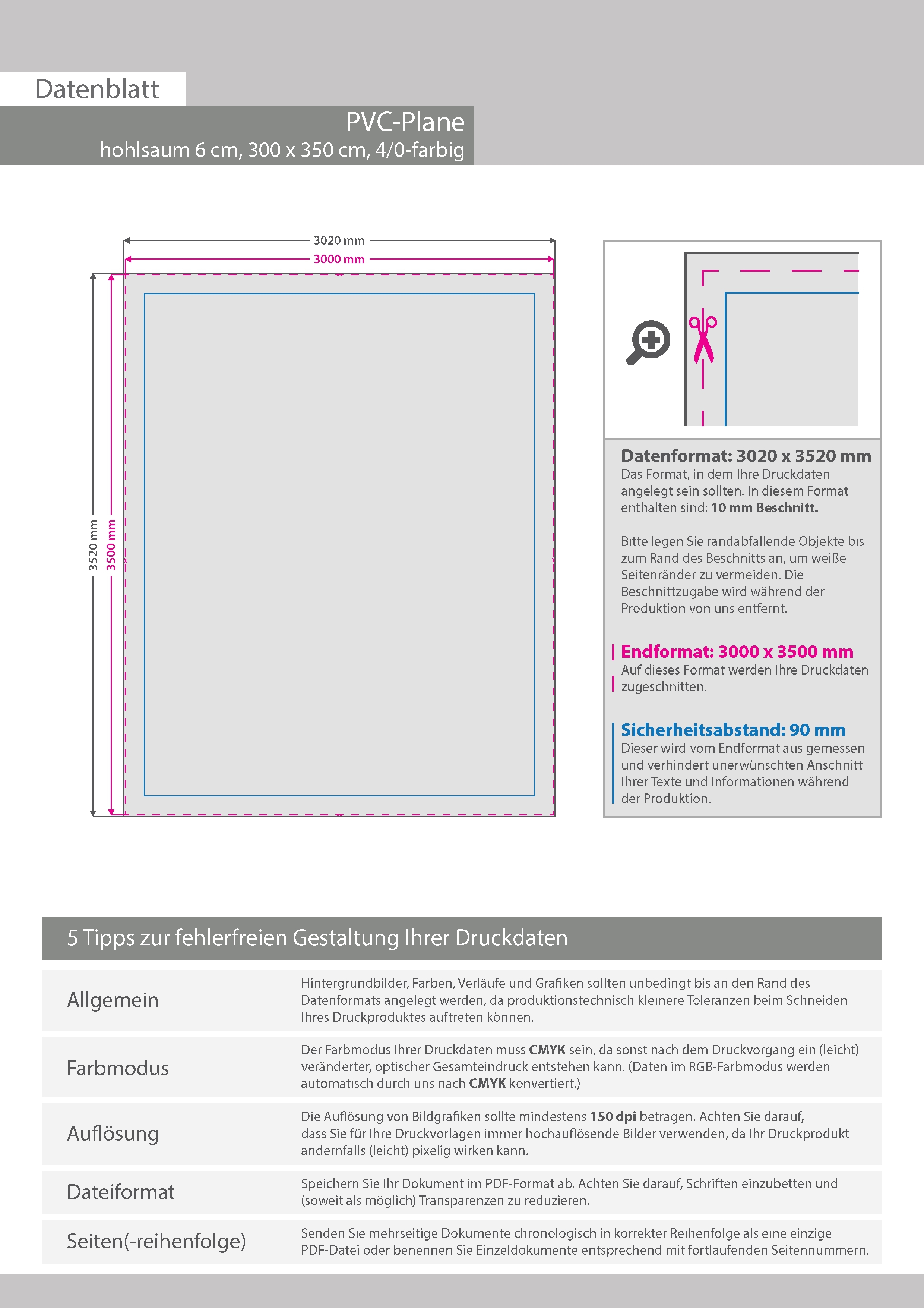 Hochwertige PVC-Plane 300 x 350 cm, 4/0-farbig bedruckt, Hohlsaum oben und unten (Durchmesser Hohlsaum 6,0 cm)